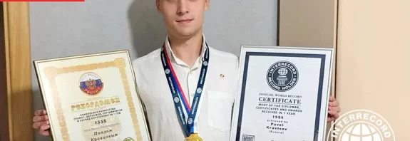 Наибольшее количество грамот, дипломов, сертификатов и наград полученных за 1 год — 1555, что было достигнуто Павлом Кравцовым (Россия). Россия, город Иркутск 31 августа 2023 года The most of the diplomas, certificates and awards received in 1 year was 1555, which was achieved by Pavel Kravtsov (Russia). Irkutsk, Russia 31 August 2023