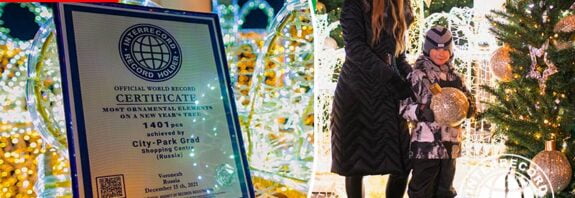 Наибольшее количество элементов украшений на новогодней ёлке составляет 1401 шт, достигнуто ТРЦ Сити-парк «Град» (Россия). Россия, Воронеж 15 декабря 2021 года The most ornamental elements on a new year’s tree — 1401 pcs. achieved by City-Park Grad Shopping Centre. Russia, Voronezh December 15, 2021